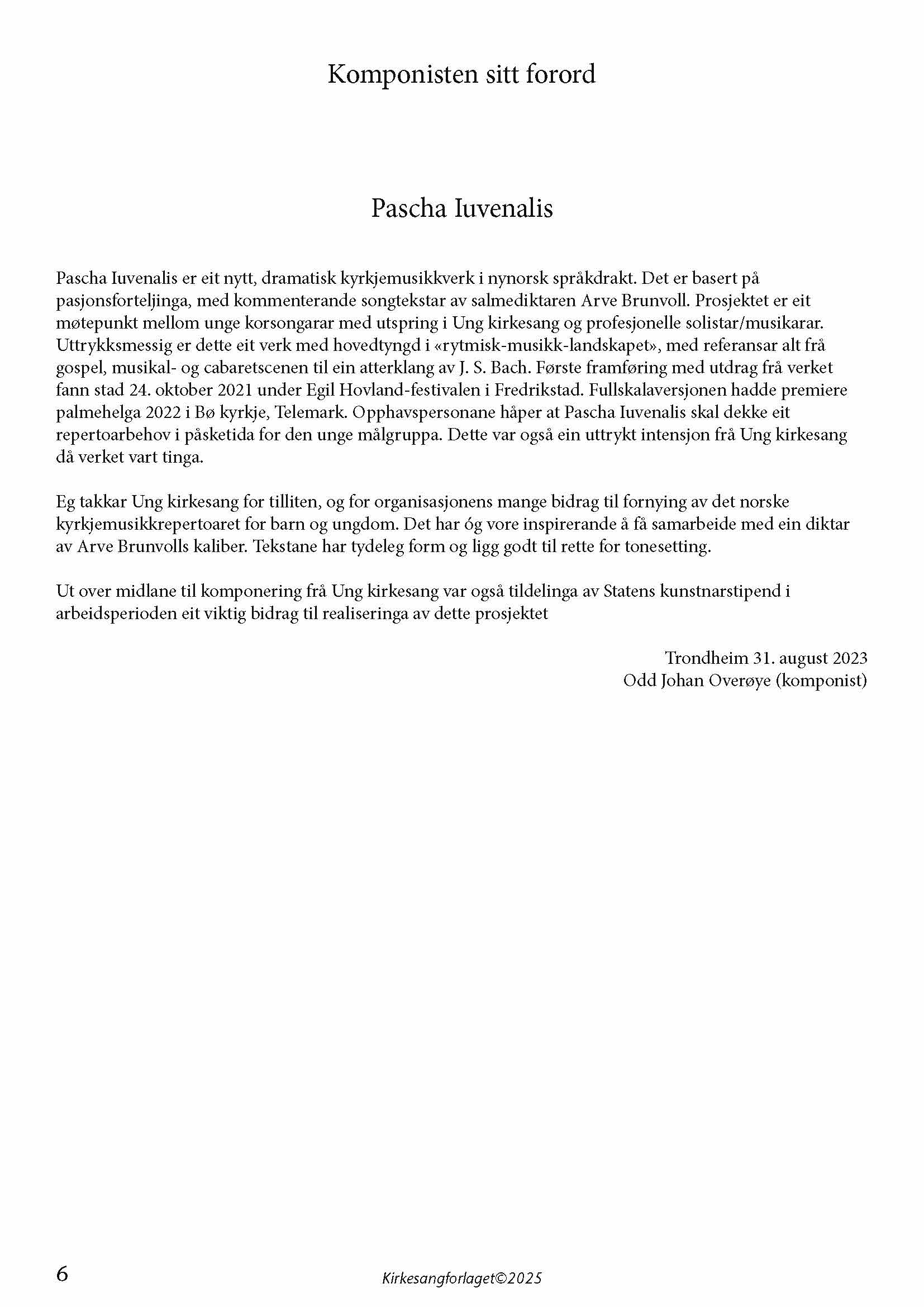 Dette verket er tinga av Ung kirkesang og Korskulen i Bø og vart innøvd og framsynt på korsommarskulen på Drottningborg, Grimstad 6. august 2021.